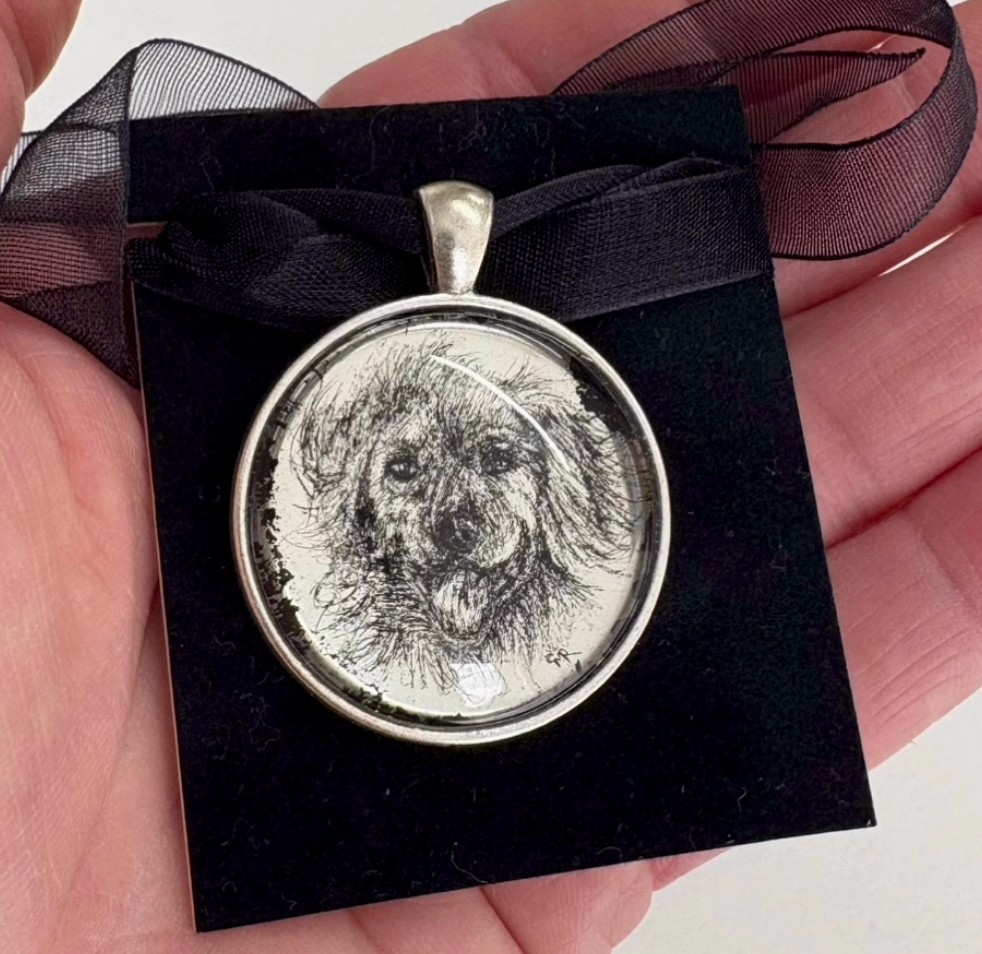3cm diameter, domed cabochon is hung on a 1cm(w) x 60cm(L) black organza ribbon. (can also be worn on a chain of your own, not included)