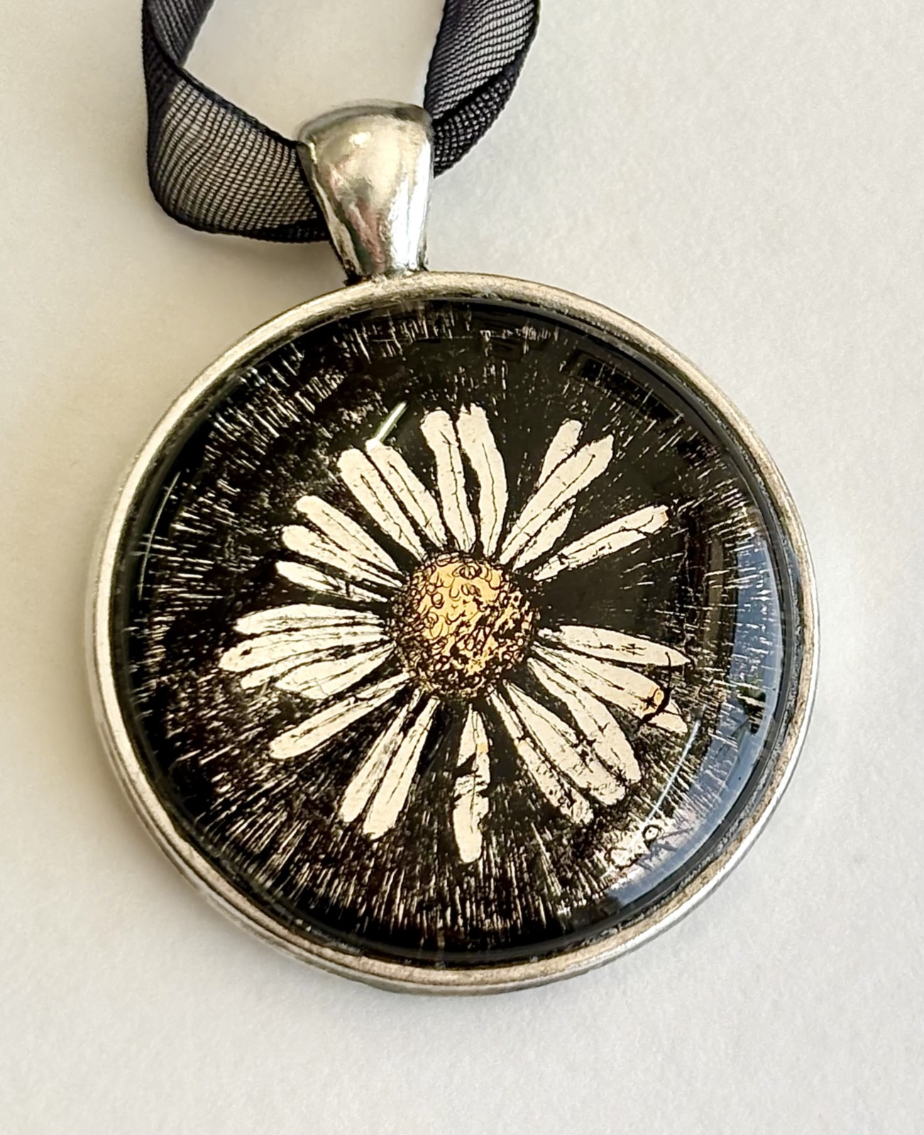 Daisy pendant is hand gilded in 7.2ct White Gold leaf with 23¾ct gold leaf.